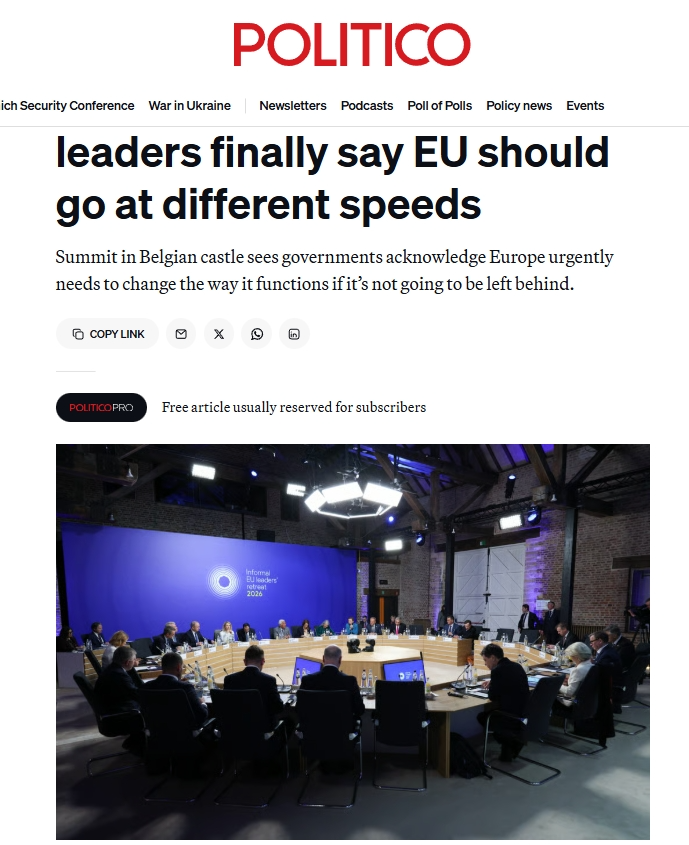 《政治報》網(wǎng)站歐洲版的報道評論稱,歐盟一直以其成員國團(tuán)結(jié)一致向前邁進(jìn)而自豪,那個時代已經(jīng)結(jié)束了。2月12日在比利時舉行的會議上,法國、德國、意大利等多國領(lǐng)導(dǎo)人支持,最早將于下個月的歐洲理事會上形成一項計劃,以簽署組成更小團(tuán)體的倡議。各國政府表示,由于歐洲的許多想法陷入優(yōu)柔寡斷和不和諧之中,歐洲的競爭優(yōu)勢正在逐漸消失,因此他們感到一種緊迫感。