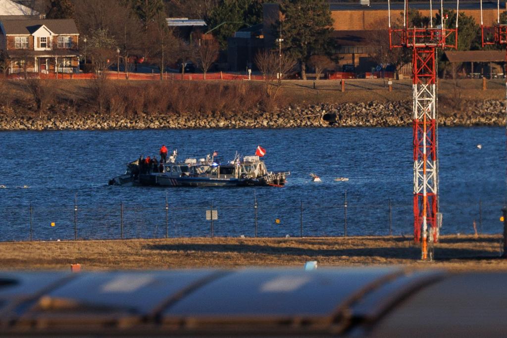 2025年2月1日,工作人員在美國(guó)華盛頓里根國(guó)家機(jī)場(chǎng)旁的波托馬克河上打撈飛機(jī)殘骸。新華社發(fā)(亞倫攝)