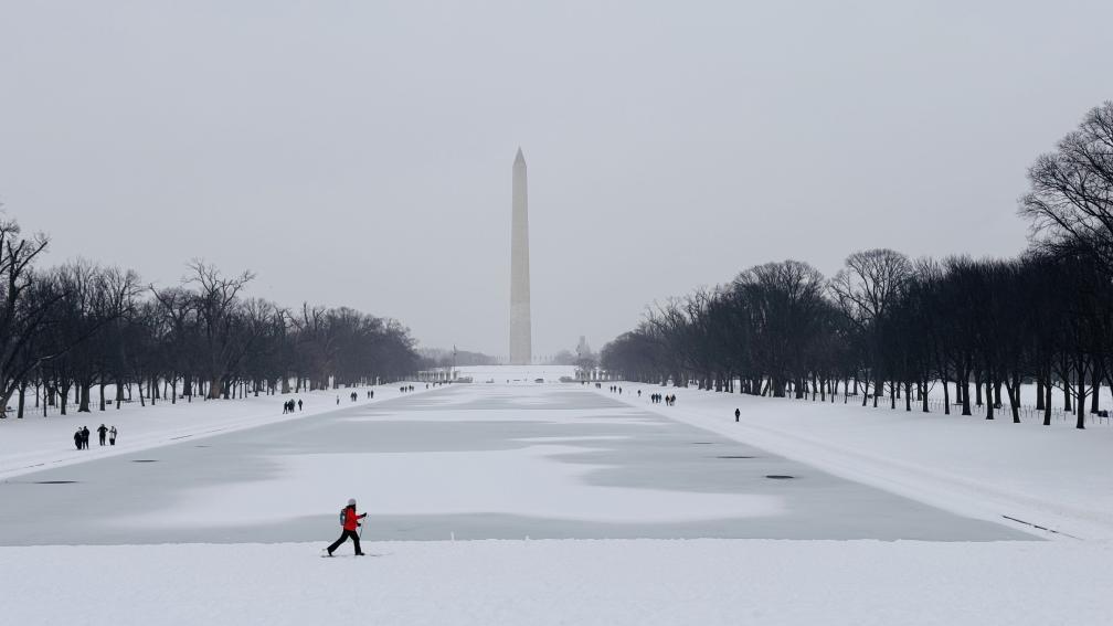 1月25日,人們?cè)诿绹?guó)首都華盛頓林肯紀(jì)念堂倒影池旁的雪中行走。新華社記者徐劍梅攝