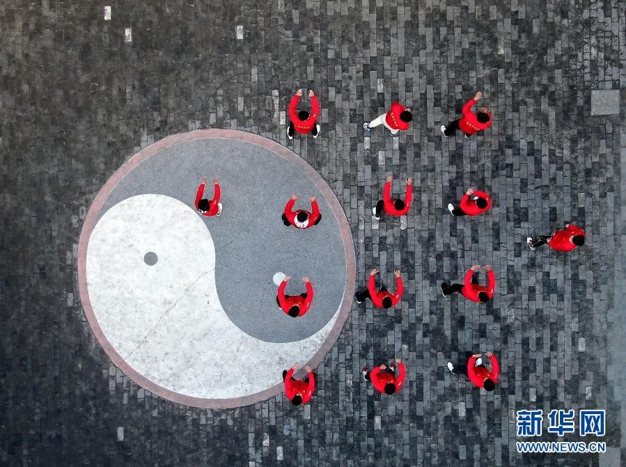 河南省焦作市溫縣第一高級(jí)中學(xué)的學(xué)生在操場上練拳(無人機(jī)照片,12月15日攝)。