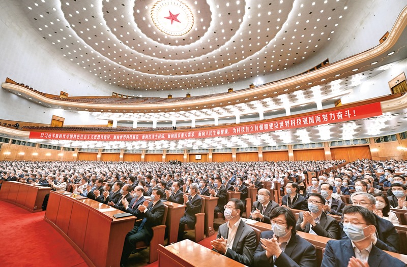 2021年5月28日,中國科學院第二十次院士大會、中國工程院第十五次院士大會和中國科學技術協會第十次全國代表大會在北京人民大會堂隆重召開。圖為大會現場。新華社記者李響/攝