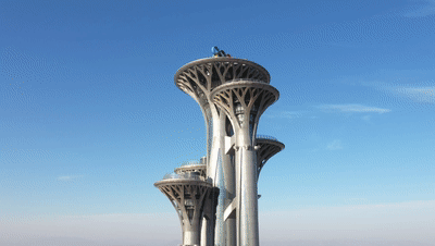△首鋼滑雪大跳臺的造型設(shè)計融入了敦煌壁畫中的“飛天”元素,建筑曲線優(yōu)美、流暢。(總臺央視記者劉岳拍攝)