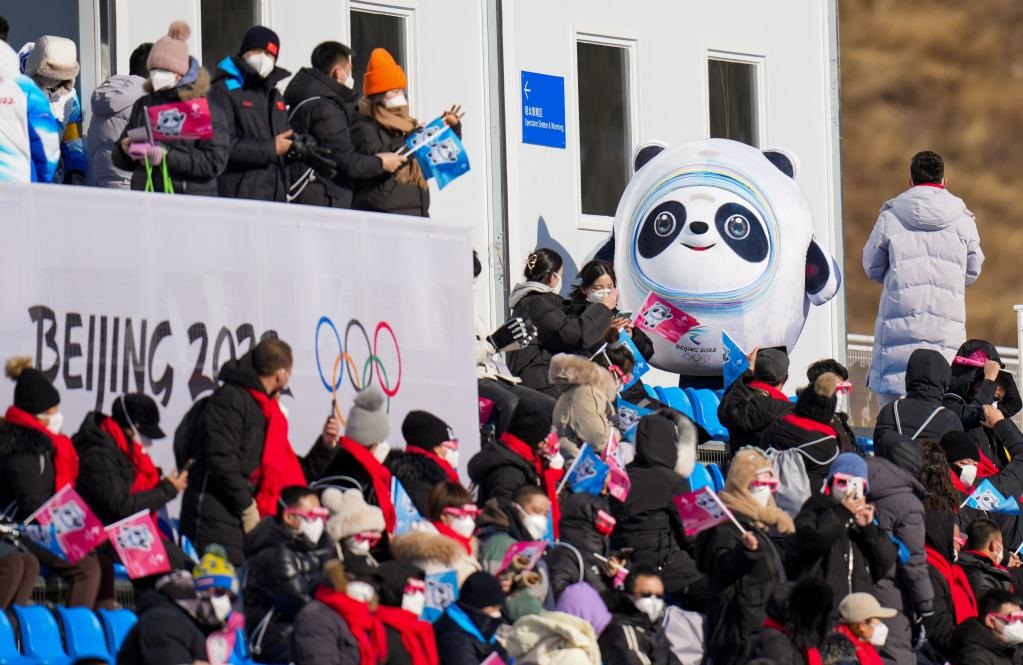 2月6日,2022年北京冬奧會(huì)越野滑雪男子雙追逐(15公里傳統(tǒng)技術(shù)+15公里自由技術(shù))比賽,吉祥物“冰墩墩”在現(xiàn)場與觀眾互動(dòng)。新華社記者劉潺攝