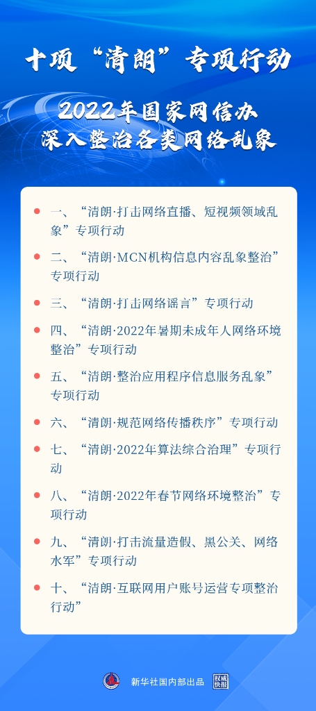 “實踐證明,開展‘清朗’系列專項行動,集中整治各類網(wǎng)絡亂象,是網(wǎng)絡生態(tài)治理的重要方式,也是維護億萬網(wǎng)民精神家園的有效手段?!眹揖W(wǎng)信辦副主任盛榮華在會上表示,2022年“清朗”系列專項行動將聚焦影響面廣、危害性大的問題開展整治,做到“三個更加突出”,即更加突出回應網(wǎng)民關切,更加突出對癥下藥,更加突出效果導向。