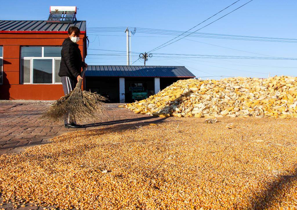 11月3日,在內(nèi)蒙古自治區(qū)通遼市開(kāi)魯縣開(kāi)魯鎮(zhèn)飛機(jī)場(chǎng)村,一名村民在院中晾曬玉米。 新華社記者連振 攝