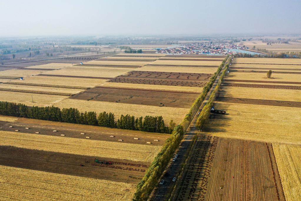 10月25日,在內(nèi)蒙古自治區(qū)通遼市開(kāi)魯縣東風(fēng)鎮(zhèn),一些地塊上的玉米和紅干椒已經(jīng)收割結(jié)束。(無(wú)人機(jī)照片)新華社記者連振 攝