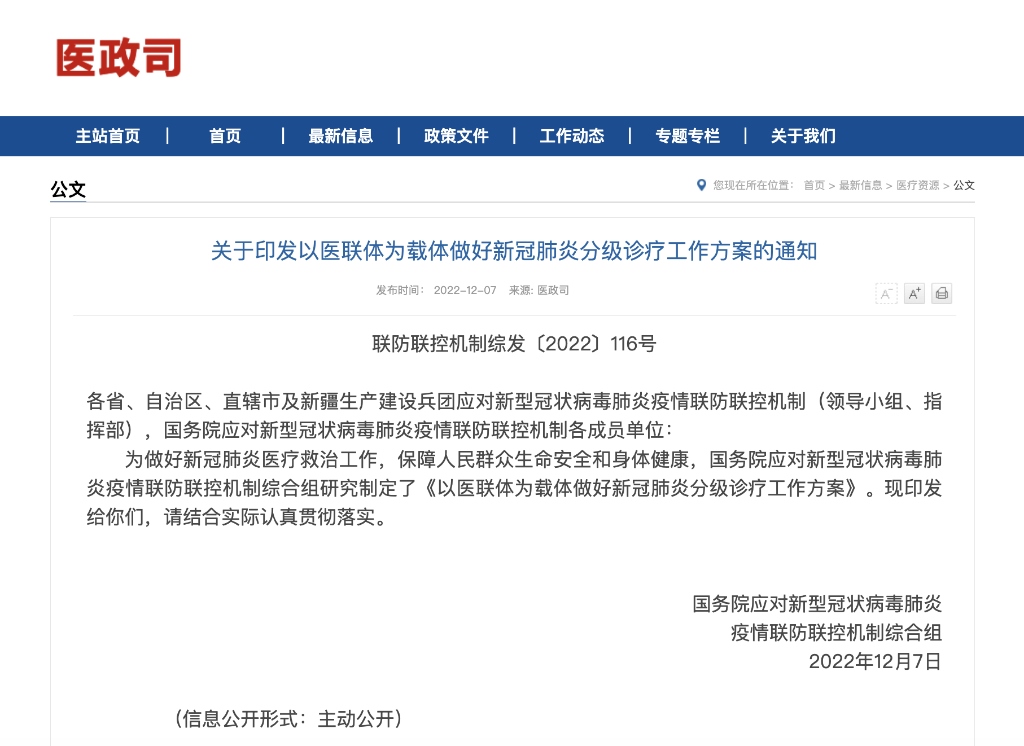 新華社北京12月7日電 為做好新冠肺炎醫(yī)療救治工作,全力保障高齡合并基礎疾病等重癥風險較高的感染者及時救治,構(gòu)建更加科學有序的就醫(yī)秩序,國務院聯(lián)防聯(lián)控機制綜合組12月7日發(fā)布《以醫(yī)聯(lián)體為載體做好新冠肺炎分級診療工作方案》。