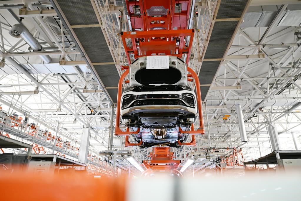 在天津經(jīng)濟(jì)技術(shù)開發(fā)區(qū)一汽-大眾華北基地,車輛在生產(chǎn)線上等待裝配零部件(2022年6月15日攝)。新華社記者 李然 攝