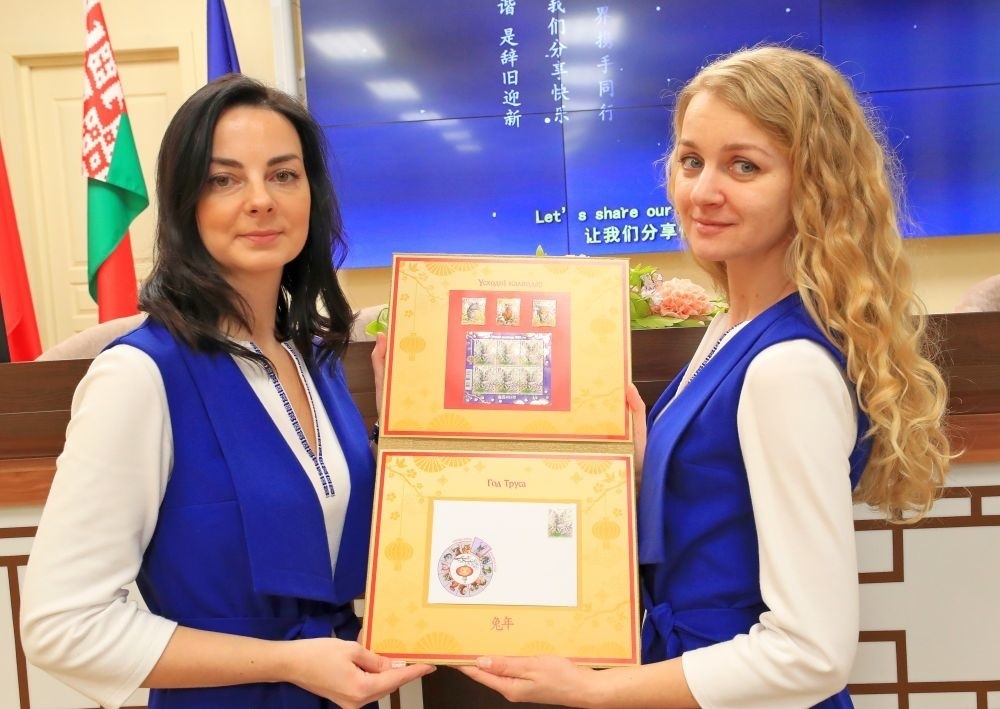 白俄羅斯國立大學(xué)孔子學(xué)院在明斯克舉辦《東方歷法:兔年》郵票和首日封發(fā)行儀式。工作人員展示白俄羅斯通信與信息化部發(fā)行的中國兔年郵票和首日封。