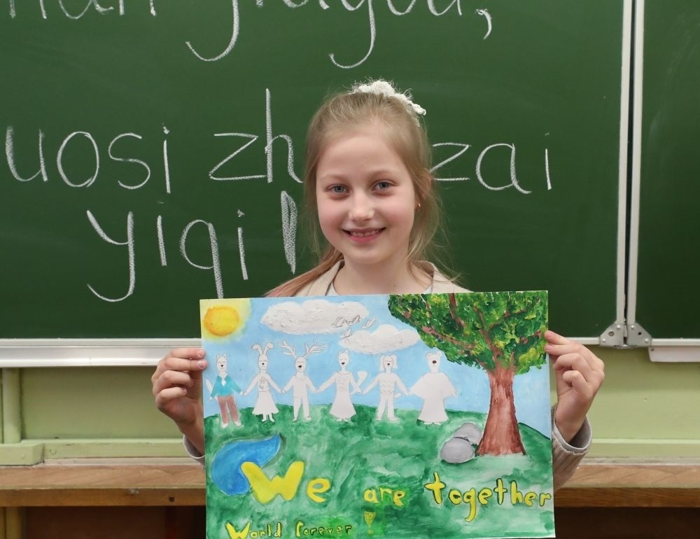 在白俄羅斯首都明斯克,一名小學(xué)生展示自己支持中國抗擊新冠肺炎疫情的繪畫作品。