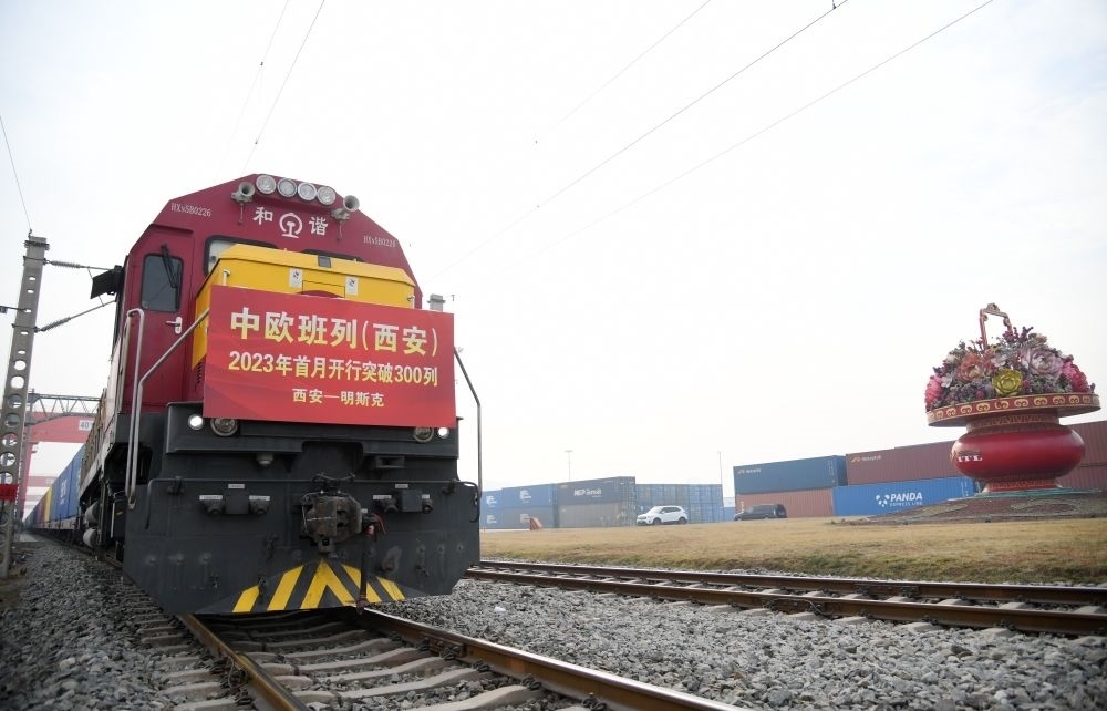 滿載日用百貨的X8151次中歐班列準(zhǔn)備從西安國際港站開往白俄羅斯首都明斯克。