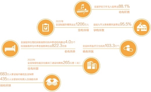 實(shí)實(shí)在在的舉措,帶來了實(shí)實(shí)在在的成效。城鄉(xiāng)學(xué)前教育公共服務(wù)體系基本建成,學(xué)前三年毛入園率由2011年的62.3%提高到2021年的88.1%。堅(jiān)持政府舉辦義務(wù)教育,九年義務(wù)教育鞏固率達(dá)95.5%,初中在校生5120.6萬人,普通小學(xué)在校生10732.0萬人;實(shí)施就業(yè)優(yōu)先戰(zhàn)略,確保就業(yè)局勢(shì)總體穩(wěn)定,2022年城鎮(zhèn)新增就業(yè)達(dá)1206萬人,脫貧人口務(wù)工規(guī)模3278萬人,100個(gè)城市公共就業(yè)服務(wù)機(jī)構(gòu)求人倍率為1.46,繼續(xù)保持在1以上,崗位供給大于求職人數(shù);著力解決群眾看病難、看病貴問題,人民健康水平穩(wěn)步提升,全國共有醫(yī)療衛(wèi)生機(jī)構(gòu)103.3萬個(gè),醫(yī)療衛(wèi)生機(jī)構(gòu)床位975萬張,參加基本醫(yī)療保險(xiǎn)人數(shù)達(dá)到134570萬人;不斷推進(jìn)養(yǎng)老事業(yè)和養(yǎng)老產(chǎn)業(yè)協(xié)同發(fā)展,養(yǎng)老服務(wù)體系更加健全,全國提供住宿的民政服務(wù)機(jī)構(gòu)中養(yǎng)老機(jī)構(gòu)達(dá)4.0萬個(gè),民政服務(wù)床位中養(yǎng)老服務(wù)床位達(dá)822.3萬張;加快推進(jìn)住房保障和供應(yīng)體系建設(shè),2022年全年全國各類棚戶區(qū)改造開工134萬套,基本建成181萬套,全國保障性租賃住房開工建設(shè)和籌集265萬套(間),群眾居住條件不斷改善;扎實(shí)做好因疫因?yàn)?zāi)遇困群眾和老弱病殘等特殊群體的基本生活保障,2022年年末,683萬人享受城市最低生活保障,435萬人享受農(nóng)村特困人員救助供養(yǎng),全年臨時(shí)救助1083萬人次,保障網(wǎng)越織越密實(shí)。