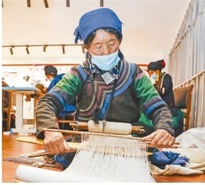 四川省涼山彝族自治州昭覺縣南坪社區(qū)的彝繡工坊內(nèi),易地扶貧搬遷到此的婦女在紡織布匹,就近就業(yè),實(shí)現(xiàn)穩(wěn)定脫貧。新華社記者 沈伯韓攝