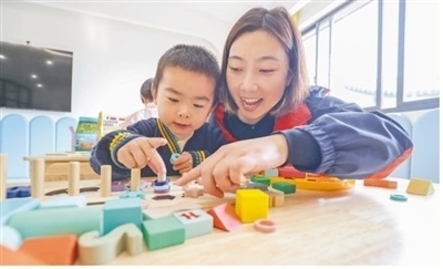 浙江省湖州市德清縣阜溪街道興山未來社區(qū)嬰幼兒照護(hù)驛站,幼兒在志愿者指導(dǎo)下拼搭積木。王樹成攝(影像中國)