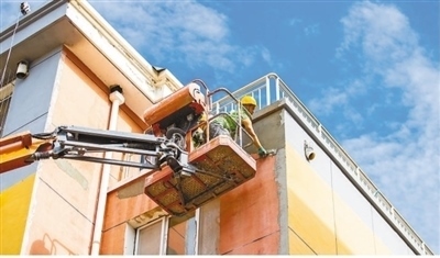 工人在內(nèi)蒙古自治區(qū)呼和浩特市玉泉區(qū)石東路街道一老舊小區(qū)改造升級(jí)現(xiàn)場(chǎng)進(jìn)行外墻真石漆施工作業(yè)。丁根厚攝(人民視覺)