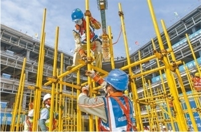 海南省建筑業(yè)職工職業(yè)技能競(jìng)賽暨質(zhì)量安全現(xiàn)場(chǎng)觀摩交流會(huì)現(xiàn)場(chǎng),建筑工人正在進(jìn)行架體搭設(shè)競(jìng)賽??档橇軘z(影像中國)