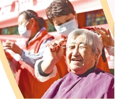 河北省唐山市豐潤(rùn)區(qū)燕山路街道欣園社區(qū),志愿者為老人免費(fèi)理發(fā)。朱大勇攝(人民視覺)