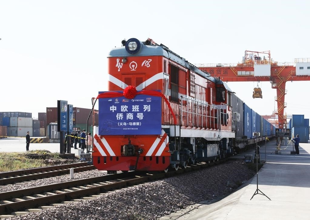 2021年11月23日,滿載著100個(gè)標(biāo)箱的“僑商號(hào)”中歐(義新歐)班列從鐵路義烏西站出發(fā),駛向西班牙首都馬德里。