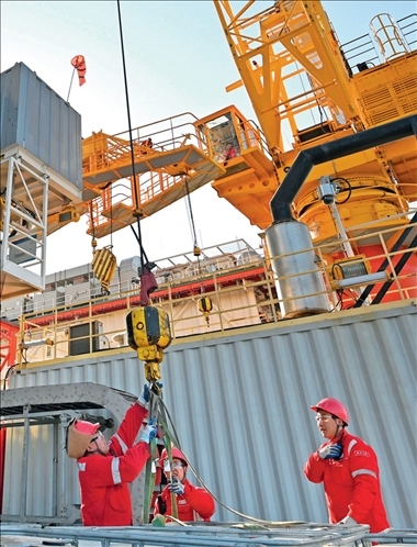 ▲ 埕海一號海上采油平臺工作人員在平臺甲板進(jìn)行吊裝作業(yè)(2023年1月16日攝) 趙子碩攝