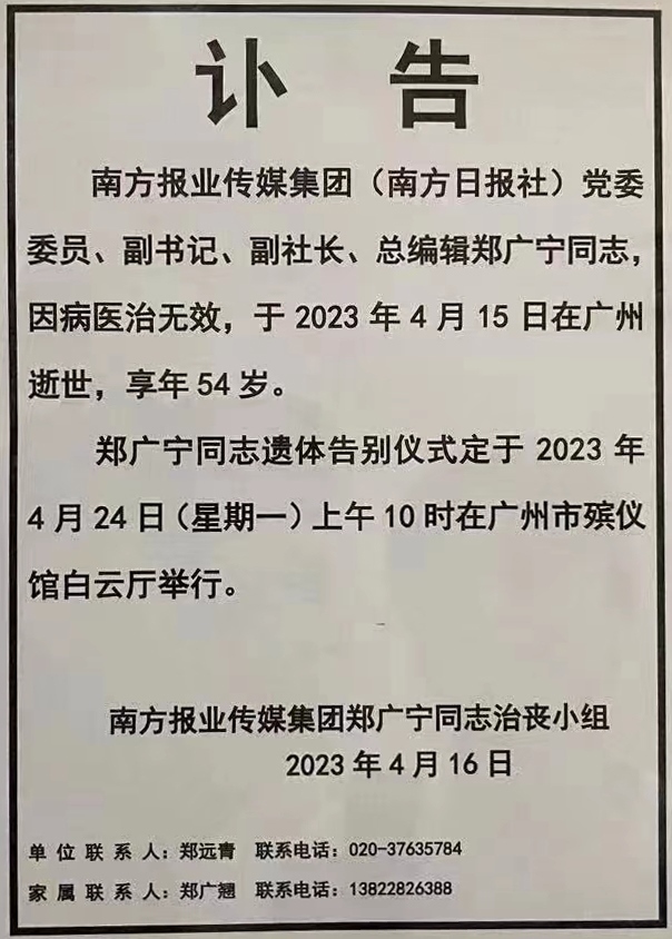 據(jù)南方報(bào)業(yè)傳媒集團(tuán)發(fā)布的訃告,南方報(bào)業(yè)傳媒集團(tuán)(南方日報(bào)社)黨委委員、副書記、副社長、總編輯鄭廣寧同志,因病醫(yī)治無效,于2023年4月15日在廣州逝世,享年54歲。