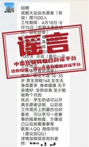 真相:近日,在部分微信群及網(wǎng)絡平臺出現(xiàn)“成都大運會志愿者招募需求”的信息,并提及“按月發(fā)放補貼”等,引發(fā)不少網(wǎng)民質(zhì)疑。針對網(wǎng)傳信息,成都第31屆世界大學生夏季運動會官方網(wǎng)站發(fā)布公告稱,成都大運會志愿者招募工作由成都大運會執(zhí)委會人力資源部(志愿者部)負責,目前賽會志愿者招募已結(jié)束,城市志愿者招募正在進行。其它任何企業(yè)、組織或個人以招募成都大運會賽會志愿者或城市志愿者的名義發(fā)布的招募活動信息均為虛假信息。請各界人士避免上當受騙,如因此受到損失和不法侵害,請立即報警,通過法律途徑解決。成都大運會賽會志愿者和城市志愿者招募過程中不會向志愿者收取報名費、培訓費、交通費等任何費用,服務期間不發(fā)放工資。成都大運會執(zhí)委會保留對涉嫌違法違規(guī)的企業(yè)、組織或個人進一步追究法律責任的權(quán)利。(來源:成都網(wǎng)絡辟謠)