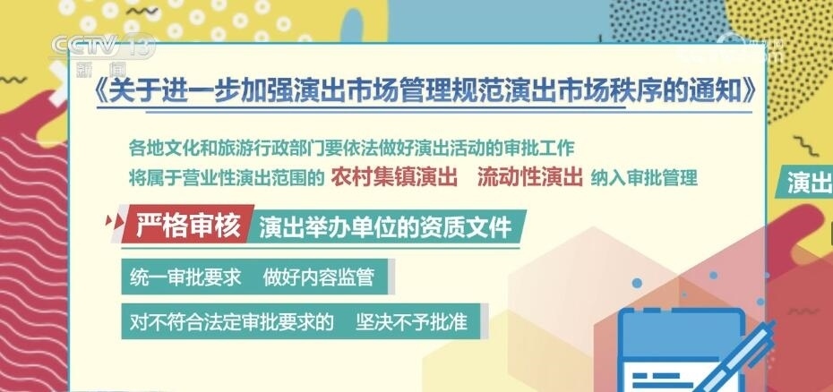 通知指出,各地文化和旅游行政部門要依法做好演出活動(dòng)的審批工作,將屬于營(yíng)業(yè)性演出范圍的農(nóng)村集鎮(zhèn)演出、流動(dòng)性演出納入審批管理,嚴(yán)格審核演出舉辦單位的資質(zhì)文件,統(tǒng)一審批要求,做好內(nèi)容監(jiān)管。對(duì)不符合法定審批要求的,堅(jiān)決不予批準(zhǔn)。文化和旅游行政部門要定期對(duì)演出場(chǎng)所進(jìn)行檢查,督促演出場(chǎng)所定期開展設(shè)施設(shè)備檢查,落實(shí)安全生產(chǎn)責(zé)任制。督促演出場(chǎng)所建立完善現(xiàn)場(chǎng)巡查制度,指定專人負(fù)責(zé)演出活動(dòng)的巡查,做好現(xiàn)場(chǎng)觀眾管理,堅(jiān)決防止擁擠、踩踏等事故發(fā)生,確保演出現(xiàn)場(chǎng)安全。各地文化和旅游行政部門要將社會(huì)關(guān)注度高、票務(wù)供需緊張的營(yíng)業(yè)性演出作為重點(diǎn)監(jiān)管對(duì)象,提前進(jìn)行研判。督促演出舉辦單位、演出票務(wù)經(jīng)營(yíng)單位面向市場(chǎng)公開銷售的營(yíng)業(yè)性演出門票數(shù)量,不得低于核準(zhǔn)觀眾數(shù)量的70%。對(duì)在票務(wù)經(jīng)營(yíng)中發(fā)現(xiàn)有炒票問(wèn)題或可能造成不良影響的,應(yīng)當(dāng)及時(shí)約談演出舉辦單位和演出票務(wù)經(jīng)營(yíng)單位,督促整改。要聯(lián)合屬地公安、市場(chǎng)監(jiān)管等部門,依法打擊“黃?!背雌?、虛假宣傳等違法違規(guī)行為,切實(shí)保障消費(fèi)者合法權(quán)益。