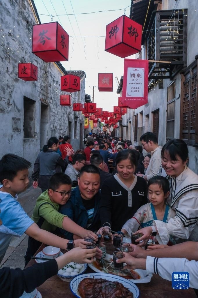 5月1日,在浙江嘉興桐鄉(xiāng)市崇福鎮(zhèn)運河文化歷史街區(qū)的橫街上,游客參加古鎮(zhèn)特色長街宴。