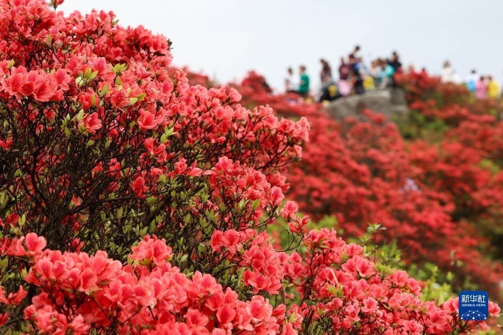5月1日,游客在貴州省黔東南苗族侗族自治州丹寨縣龍泉山景區(qū)賞花游玩。
