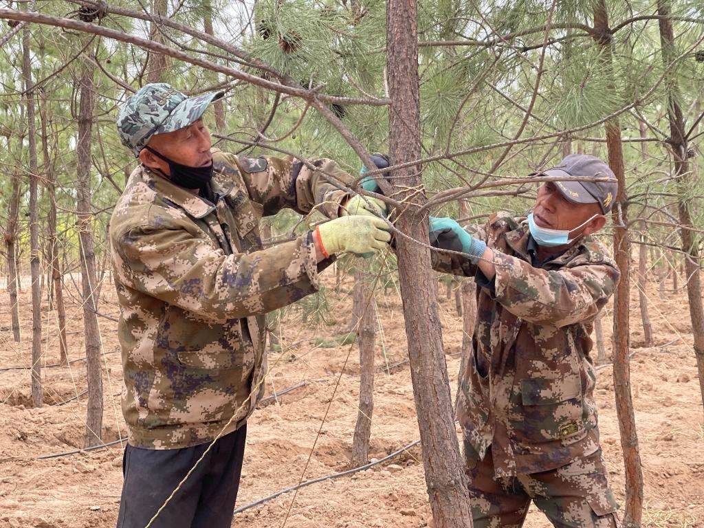 面龐黝黑的丁河勇在白芨灘工作了31年,治沙的情懷像樹苗一樣扎根在這片土地。“呵護(hù)這些樹苗就像呵護(hù)我的孩子一樣,修剪、澆灌、補(bǔ)植、病蟲害防治,絲毫馬虎不得。我已經(jīng)習(xí)慣了與樹為伴的生活,隔兩天不上山看看林子,心里就不踏實?!彼f。