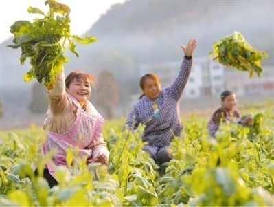 貴州省黔東南苗族侗族自治州岑鞏縣關(guān)莊村芥菜種植基地,村民們在采收芥菜。胡攀學(xué)攝(人民視覺)