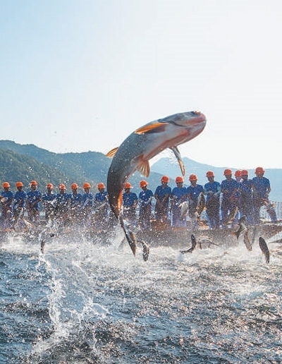 浙江省杭州市淳安縣千島湖國家級水產(chǎn)種質(zhì)資源保護區(qū)內(nèi),漁民在進行“巨網(wǎng)捕魚”。謝航凱攝(影像中國)