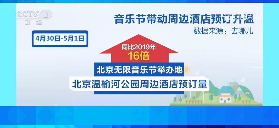 4月29日—5月1日,北京草莓音樂(lè)節(jié)舉辦地延慶世園公園周邊的酒店預(yù)訂量,同比2019年增長(zhǎng)18倍。4月30日—5月1日,北京無(wú)限音樂(lè)節(jié)舉辦地北京溫榆河公園周邊酒店預(yù)訂量,同比2019年增長(zhǎng)16倍。