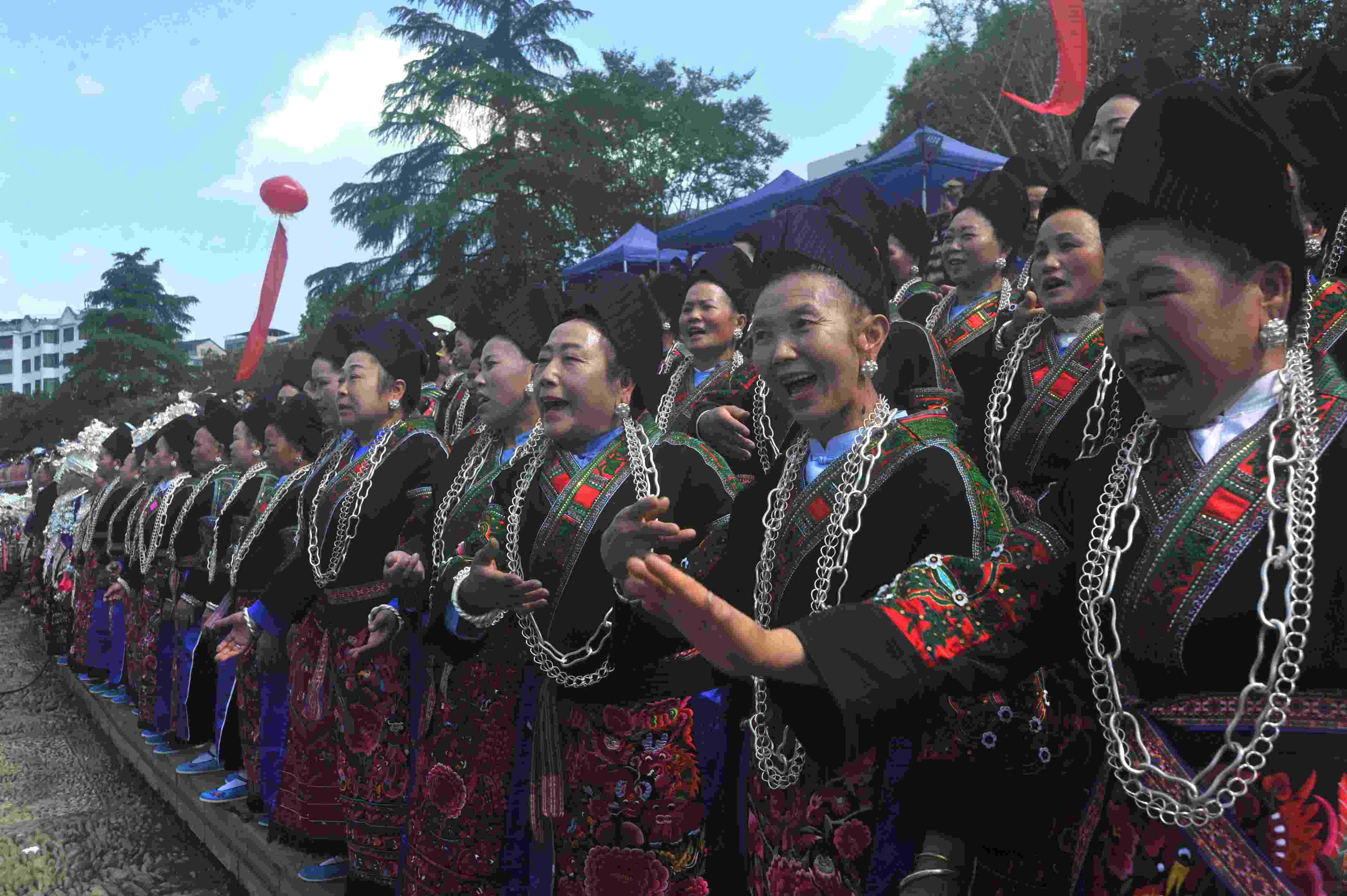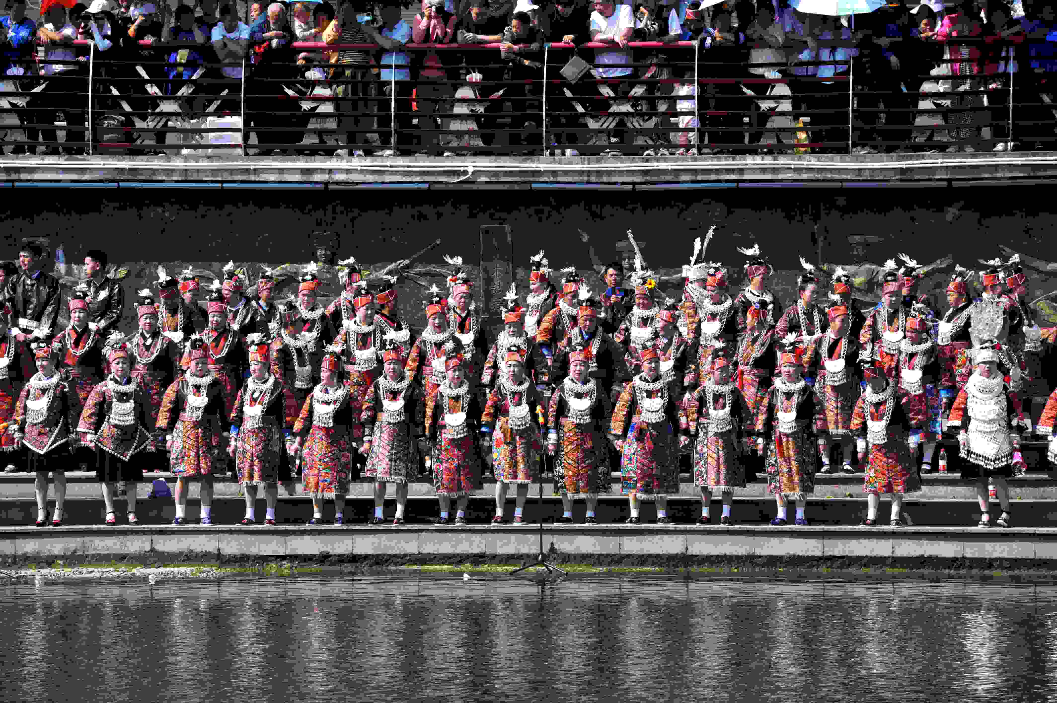 2023年5月3日,苗族同胞在貴州省臺(tái)江縣翁你河畔對唱苗歌。當(dāng)日,貴州省臺(tái)江縣九個(gè)苗族支系的萬余名苗族男女歌手齊聚縣城翁你河畔,對唱苗族古歌、苗族多聲部情歌和飛歌,向世人展示古樸濃厚的苗族文化底蘊(yùn)。 (寧堅(jiān) 鄧永生)