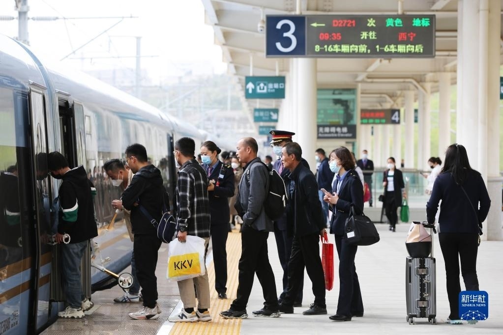 5月3日,旅客在南京火車站乘車出行。   新華社發(fā)(蘇陽攝)