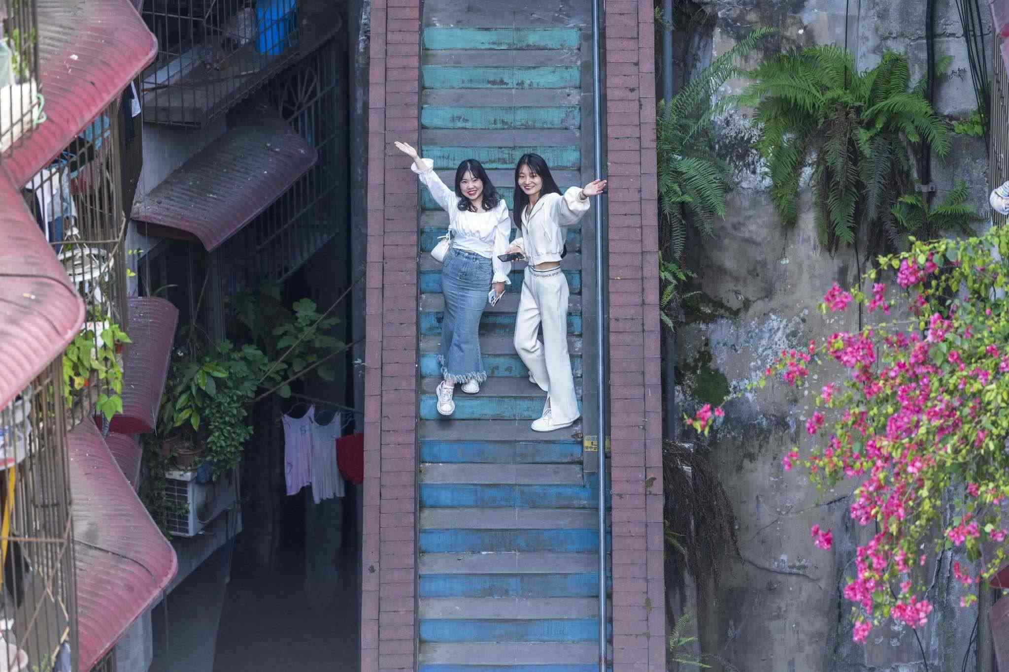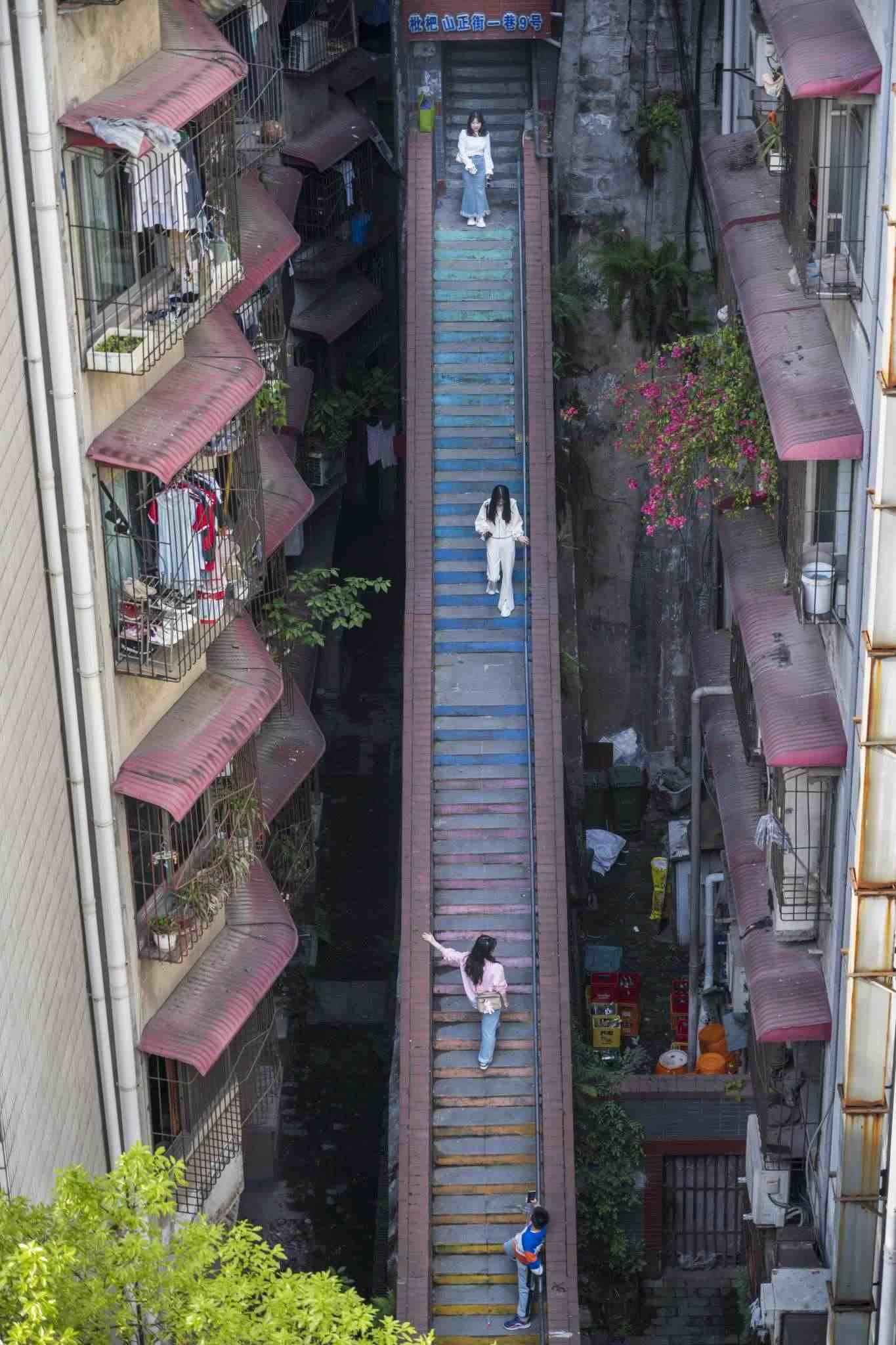 “彩虹樓梯”位于重慶渝中區(qū)枇杷山正街的居民樓間,高約20米,共有50多級階梯,極具山城特色。經(jīng)過多種顏色涂鴉后,吸引不少市民和攝影愛好者“打卡”。視覺中國
