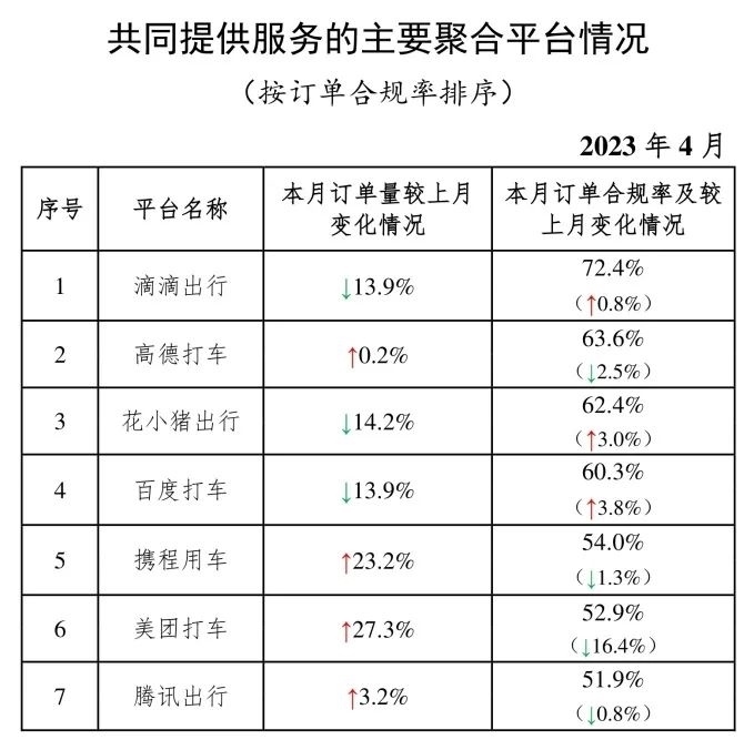 其中,面向乘客、與網(wǎng)約車平臺公司共同提供服務的平臺(俗稱“聚合平臺”)完成1.96億單,環(huán)比下降0.7%。按訂單合規(guī)率由高到低的分別是滴滴出行、高德打車、花小豬出行、百度打車、攜程用車、美團打車、騰訊出行。