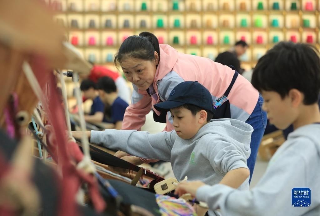 5月12日,來自上海包玉剛實驗學校的學生在張家界市武陵源區(qū)乖幺妹土家族織錦基地學習體驗土家族織錦非遺技藝。