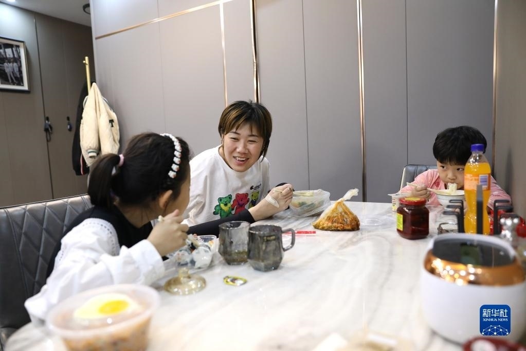 5月11日,韓丹和孩子在家里一邊吃飯,一邊交流。