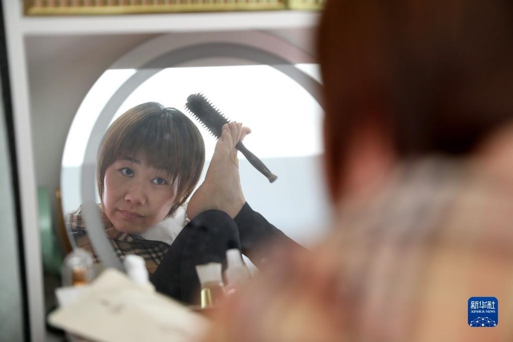 5月11日,韓丹在出門前梳頭。