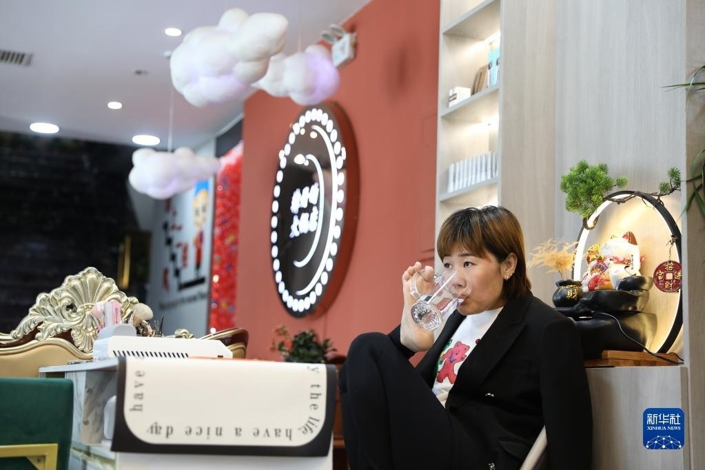 5月11日,韓丹在自己開的火鍋店里休息喝水。