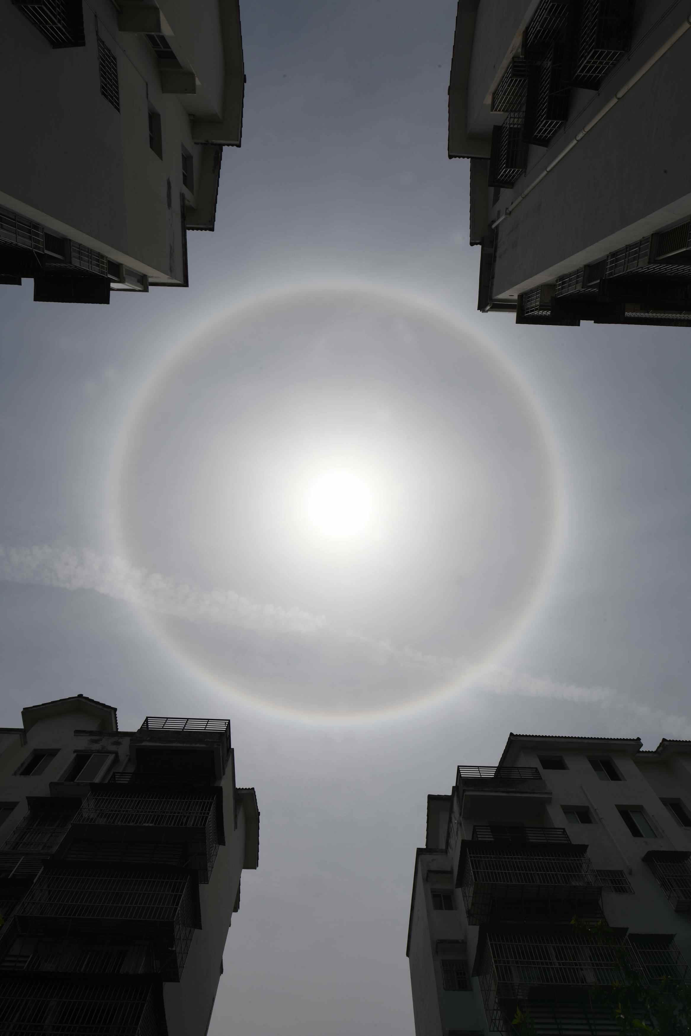 2023年5月15日中午,湖北宜昌,天空出現日暈景觀。當日,多地天空出現日暈。日暈是一種大氣光學現象,是太陽光通過云層中的冰晶折射或反射而形成的。 視覺中國