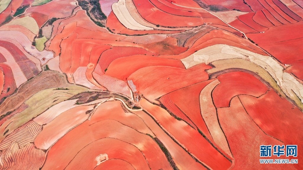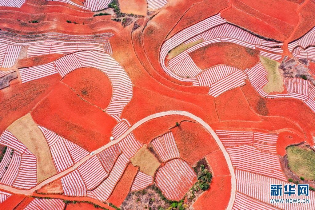 云南省尋甸回族彝族自治縣,連綿不斷的旱梯田遍布山間,遠(yuǎn)接天邊,每年4-5月,經(jīng)過(guò)村民翻新、平整后的紅褐色土地,從空中俯瞰五彩斑斕、蔚為壯觀。當(dāng)?shù)卮迕裥燎诟旁诜饰值募t土地上,用勤勞的雙手,繪就一幅幅勞動(dòng)藝術(shù)畫(huà)作。新華網(wǎng)發(fā)(孫文來(lái) 攝影報(bào)道)