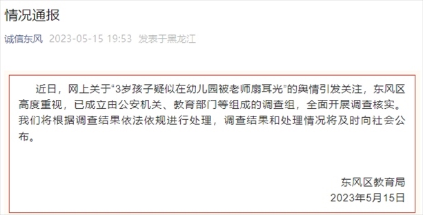 ·網(wǎng)傳“3歲孩子疑被幼師扇耳光”,官方通報:已成立調查組全面調查核實。