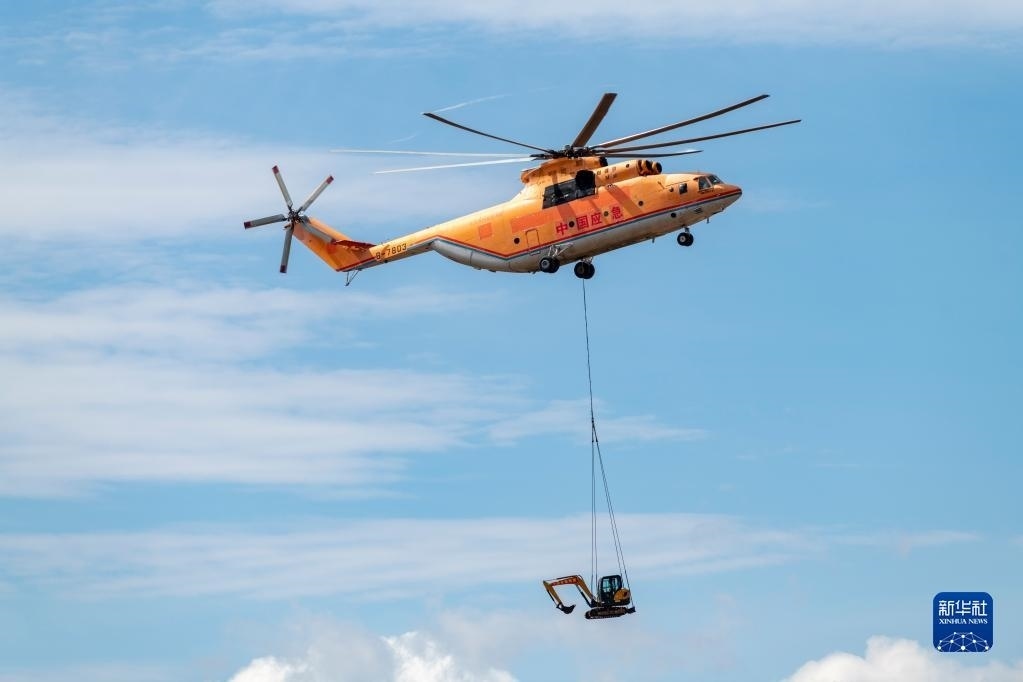 5月16日,一架參演直升機在麗江演習現場上空轉運一臺挖掘機。   新華社記者 陳欣波 攝