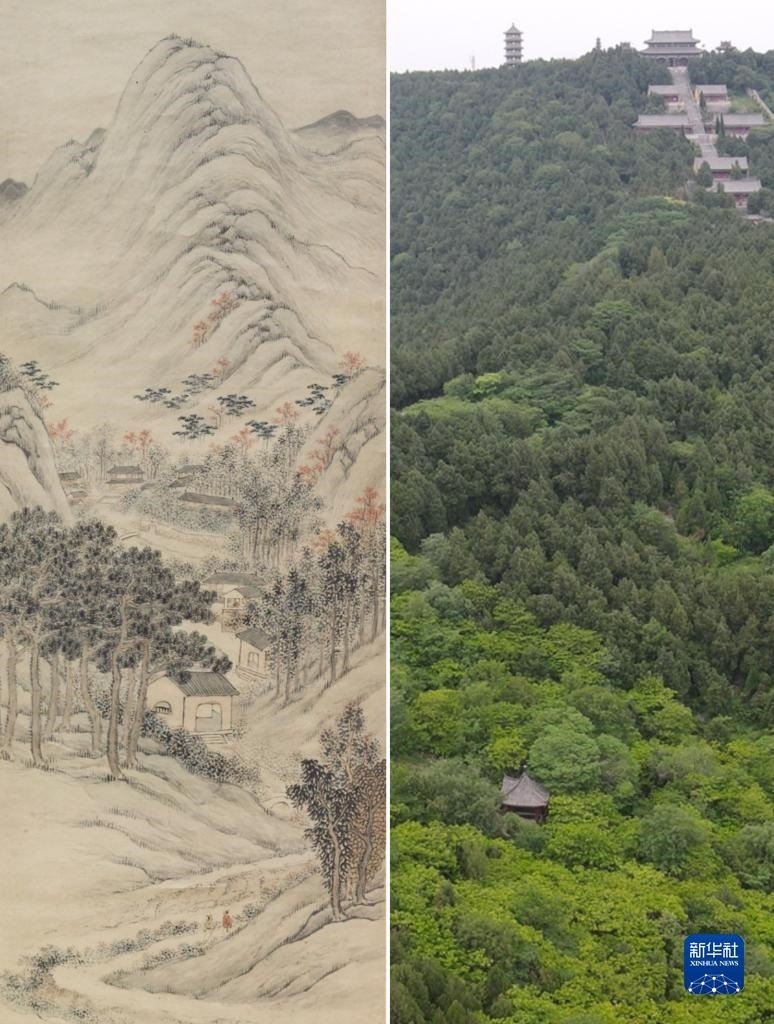 這是一張拼版照片,左圖為:《八公秋霽圖》,由清代畫(huà)家潘思牧創(chuàng)作,現(xiàn)收藏于安徽博物院(新華社發(fā),李鵬飛 攝);右圖為:5月16日拍攝的位于安徽省淮南市壽縣的八公山風(fēng)景區(qū)(無(wú)人機(jī)照片,新華社記者張端攝)。
