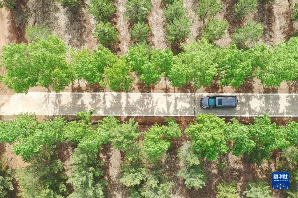 車輛在山西省右玉縣新城鎮(zhèn)道路上行駛(5月19日攝,無人機(jī)照片)。