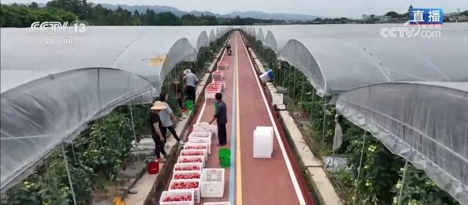 總臺記者 蔣林:歡迎各位繼續(xù)跟隨著我們在四川看看“三夏”時節(jié)的農(nóng)忙景象。此刻我從平原地區(qū)的水稻高標準農(nóng)田來到了金銀河村的蔬菜種植產(chǎn)業(yè)園。通過空中航拍的畫面大家可以看到,金銀河村緊臨著長江的三級支流青衣江,歷史上的金銀河村就是來自青衣江的沖刷和堆積,村里的土地含沙量高,土壤保水能力不夠,不適合栽種像水稻這樣的需要農(nóng)田蓄水、保水的作物。當然,這樣的土地對于很多蔬菜品種來說,卻是絕佳好地,當?shù)匾虻刂埔烁闫鹆怂竞褪卟斯灿械默F(xiàn)代產(chǎn)業(yè)園區(qū)。在這個園區(qū),適合蔬菜種植的面積達到7萬畝,平均一年能種三季蔬菜,大大提升了土地產(chǎn)出與利用效果,也保證了每一個人的“菜籃子”。眼下,今年春天播種的番茄、黃瓜、茄子、豇豆等眾多時令蔬菜陸續(xù)成熟,新鮮上市,讓我們感受到初夏時節(jié)的豐收景象。