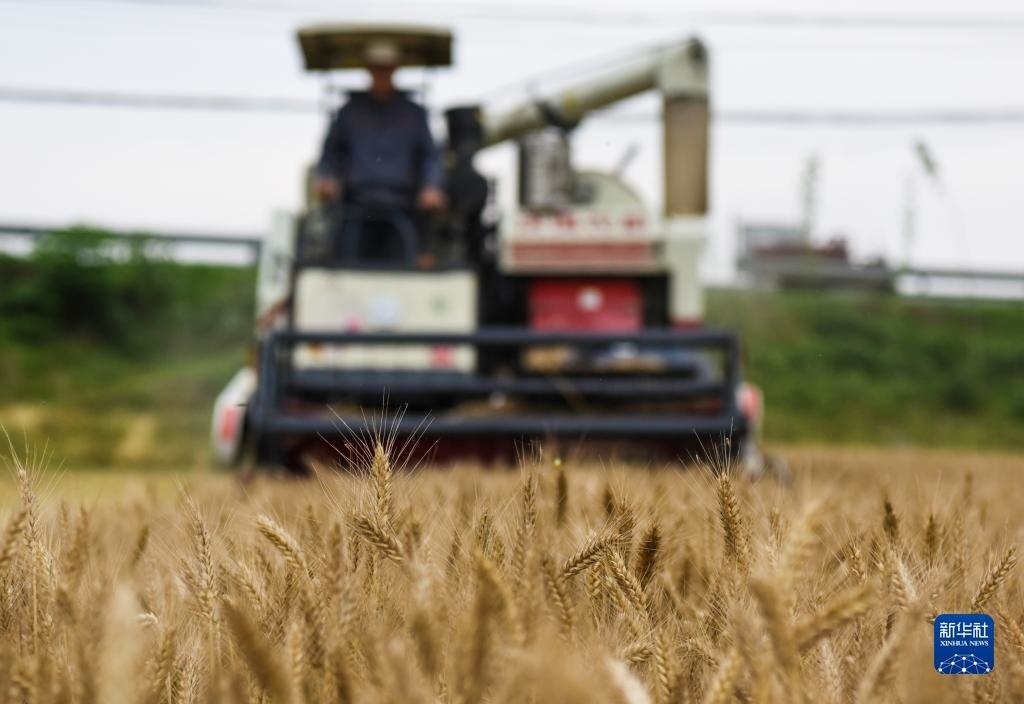 5月23日,河南省駐馬店市正陽(yáng)縣大林鎮(zhèn)漫塘村的村民駕駛農(nóng)機(jī)收獲小麥。   新華社發(fā)(高萬(wàn)寶攝)