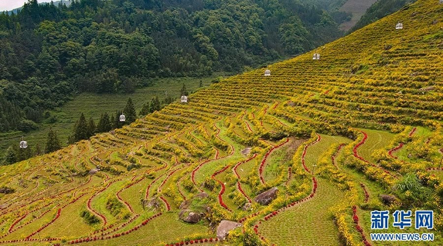 5月,在廣西桂林市龍勝縣泗水鄉(xiāng),近千畝連綿一片的布尼梯田已花開(kāi)成海,絢麗多彩的花海梯田吸引游客前來(lái)打卡拍照。 (伍春媛)