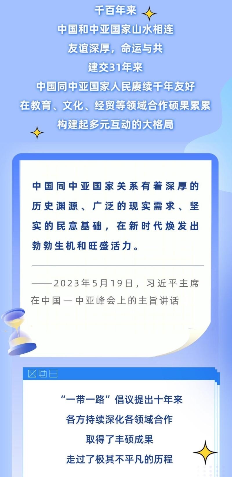 “今天我們?cè)谖靼蚕嗑?,續(xù)寫千年友誼,開辟嶄新未來(lái),具有十分重要的意義?!?月19日,習(xí)近平主席在陜西西安主持中國(guó)—中亞峰會(huì),并發(fā)表題為《攜手建設(shè)守望相助、共同發(fā)展、普遍安全、世代友好的中國(guó)—中亞命運(yùn)共同體》的主旨講話。
